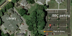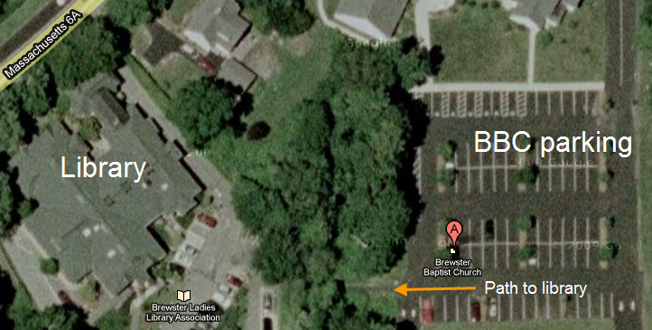 Please park in the back parking lot at the church and look for the path leading to Brewster Ladies Library (Red Building), and then enter the Library Meeting Room directly using the door at the parking lot level.